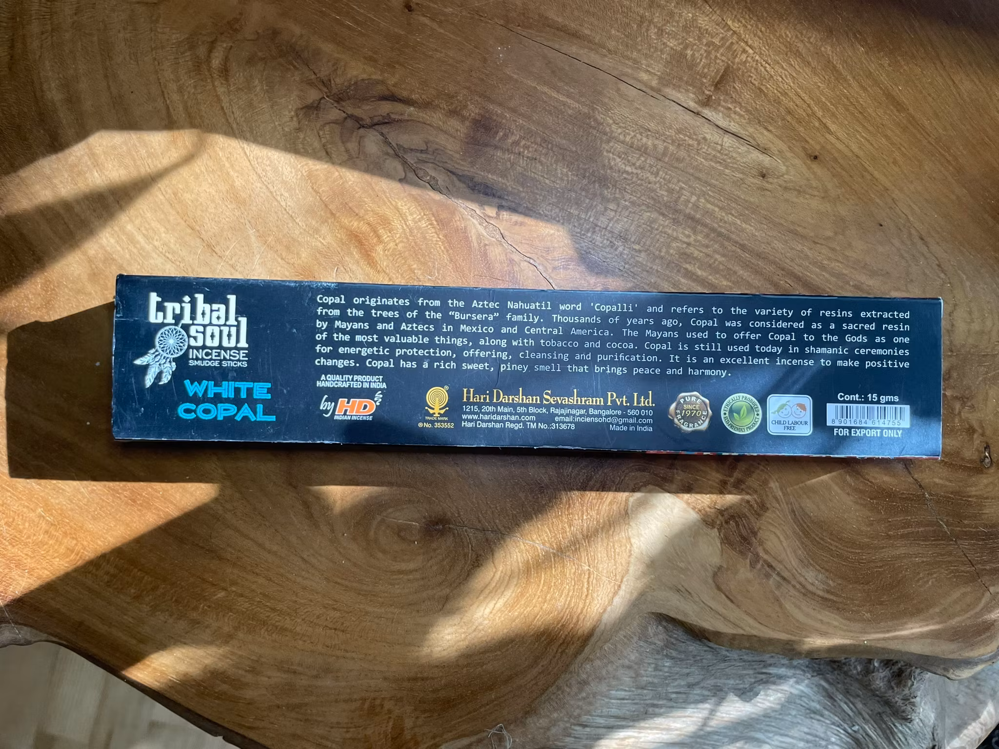 White Copal Rökelsepinnar från Tribal Soul har en mild och träig doft med inslag av söt balsam och tall. Doften är mjukt hartsig och ger en lugn och renande känsla.