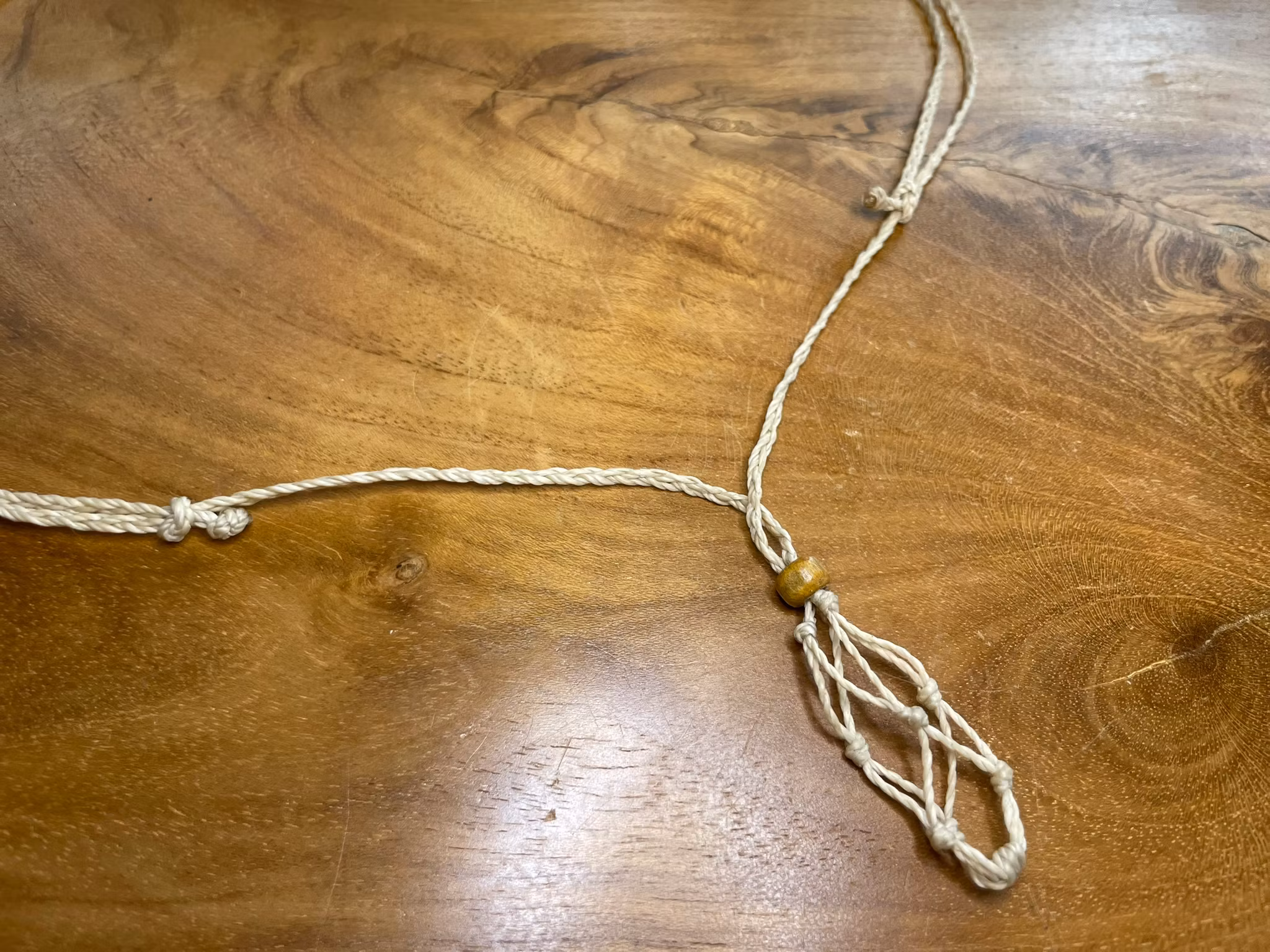 Ett handflätat enkelt halsband i beige vaxad tråd, utformat som en justerbar kristallhållare. Du kan enkelt själv placera och byta kristall i halsbandet genom att föra träpärlan upp för att öppna eller ned för att stänga.