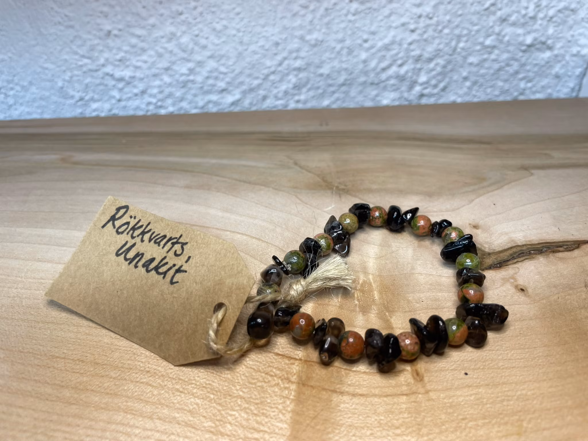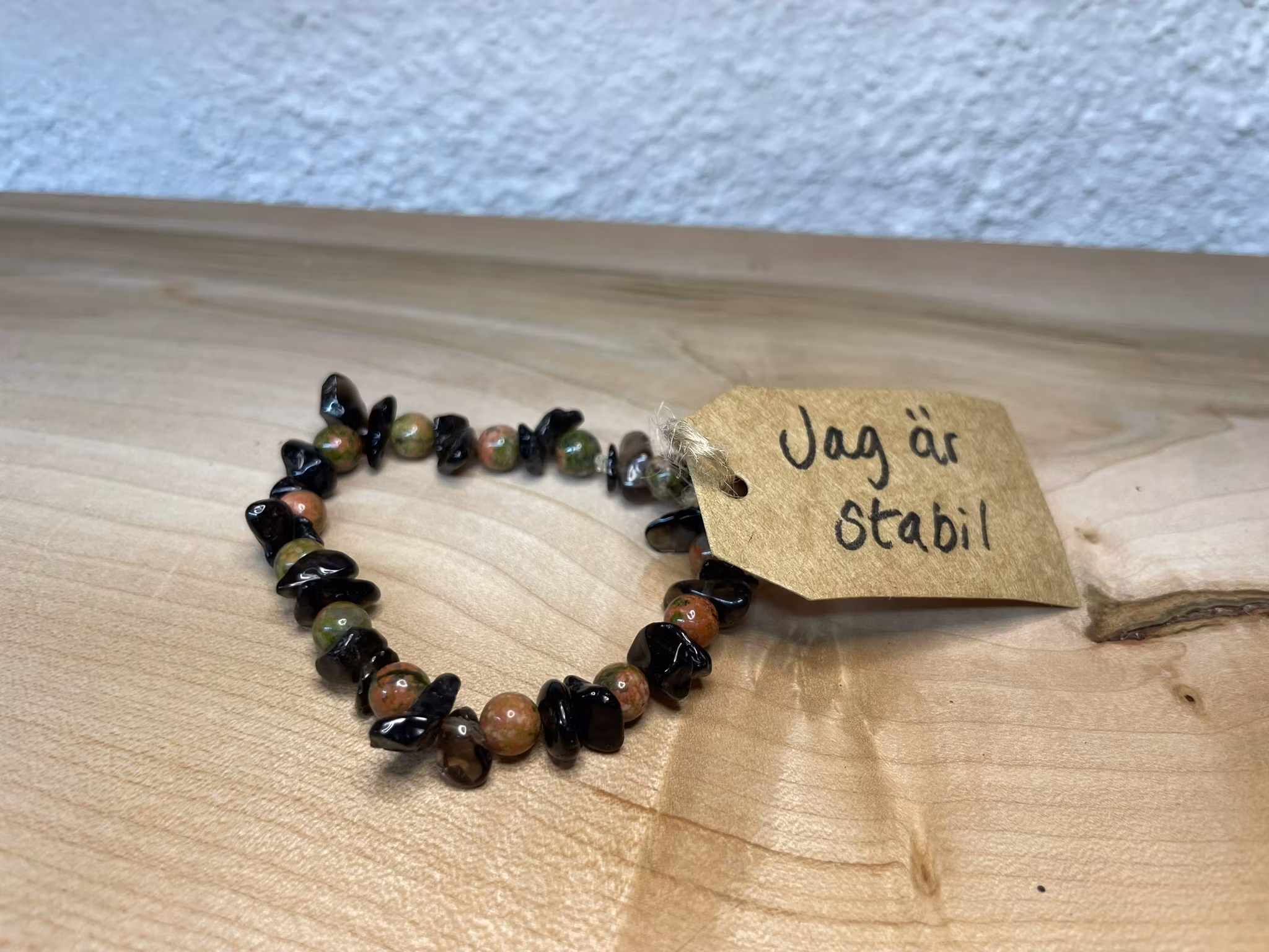 Affirmationsarmband "Jag är stabil" men Unakit och Rökkvarts stl: S 188 kr Produkten är tyvärr slut i lager :( Dela Produktbeskrivning Elastiskt affirmationsarmband med kristaller av Unakit och Rökkvarts.Armband är handgjort av mig Matilda Lindstaf.Detta armband mäter ca 16 cm i omkrets plus stretch.