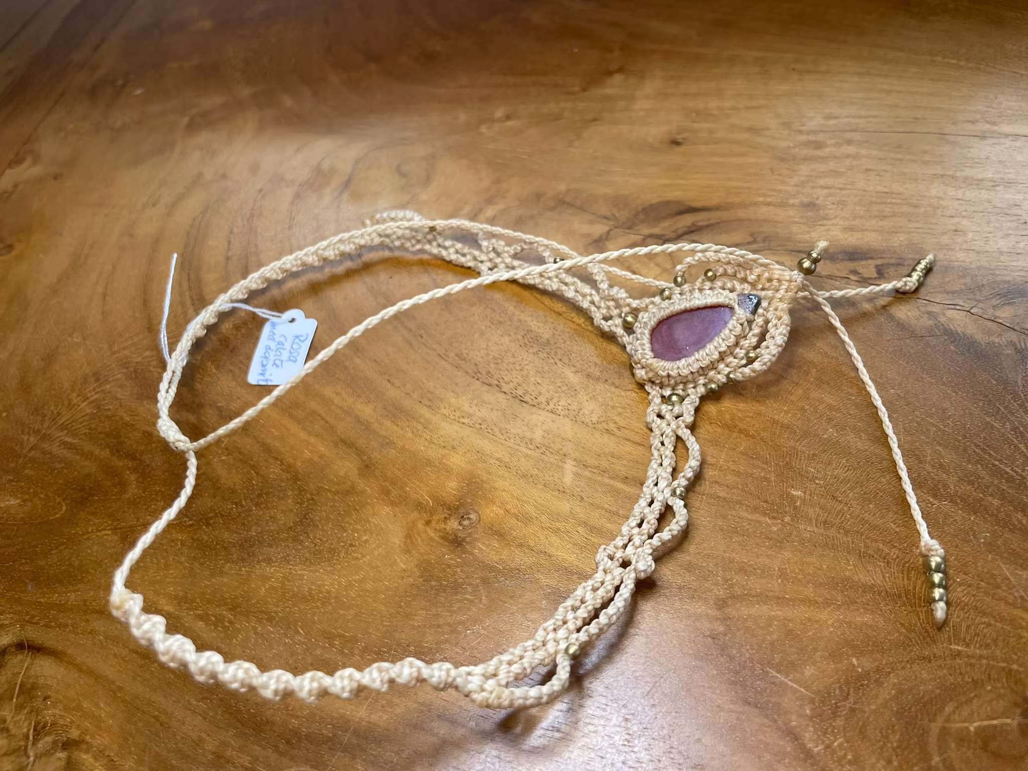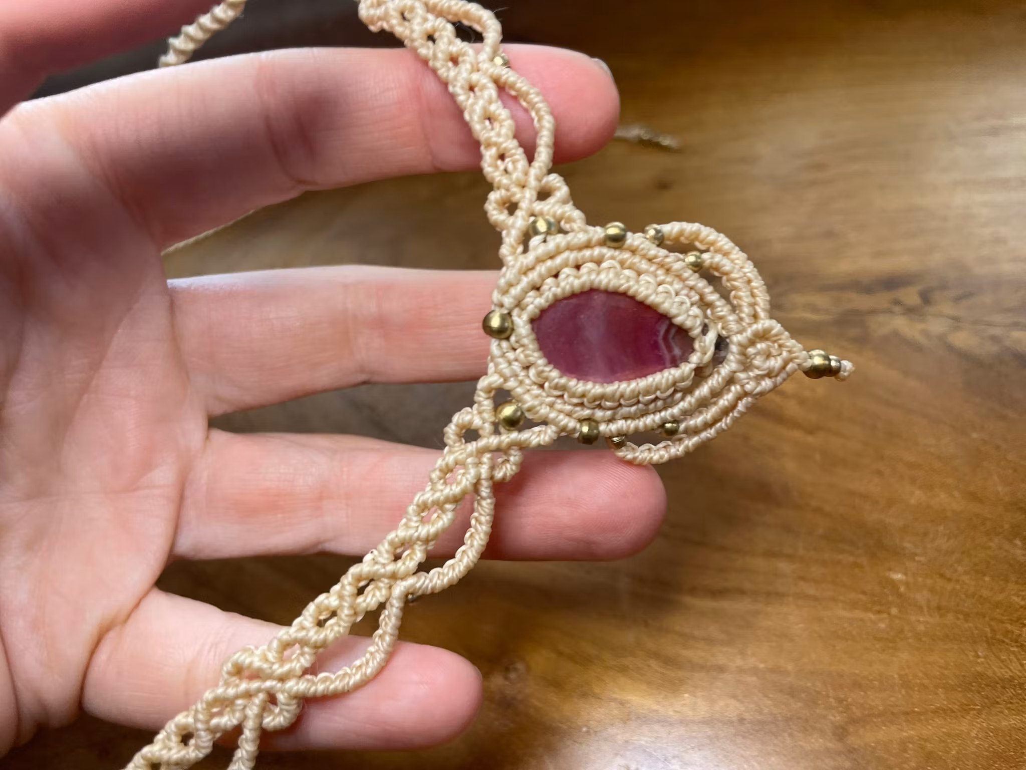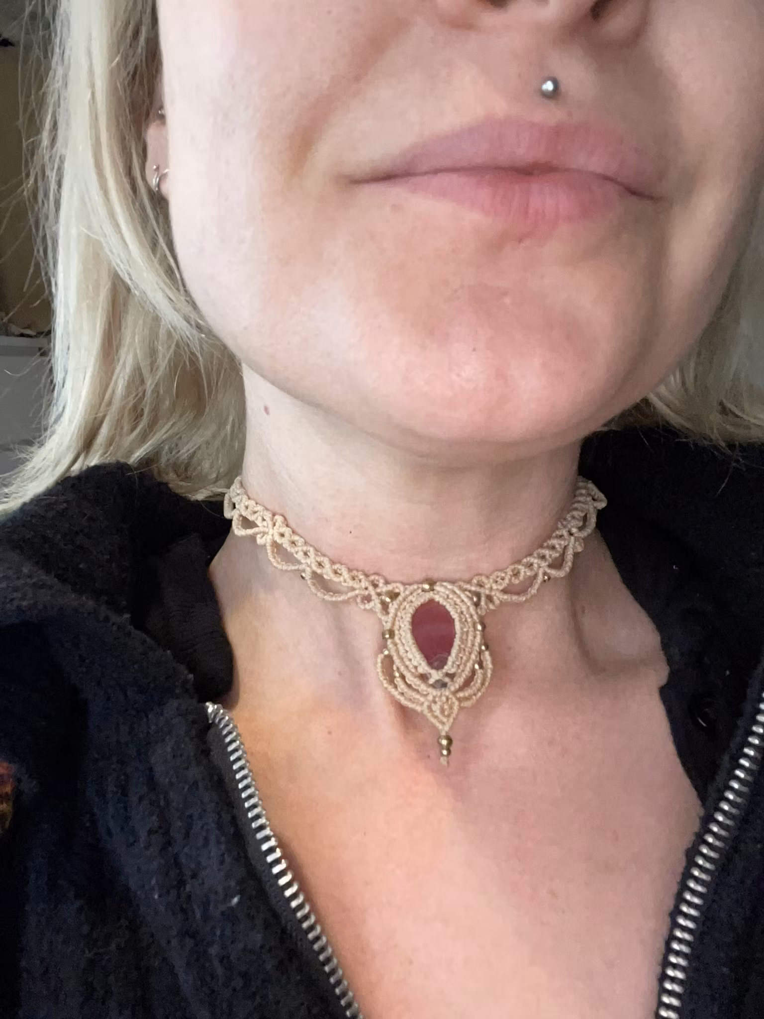 “Nocturna” är ett handknutet choker/halsband i ljus vaxad tråd med detaljer i mässing. I mitten sitter en sten bestående av rosa Kalcit med Dolomit. Handgjort av Maria Florencia (@bohemiflow).