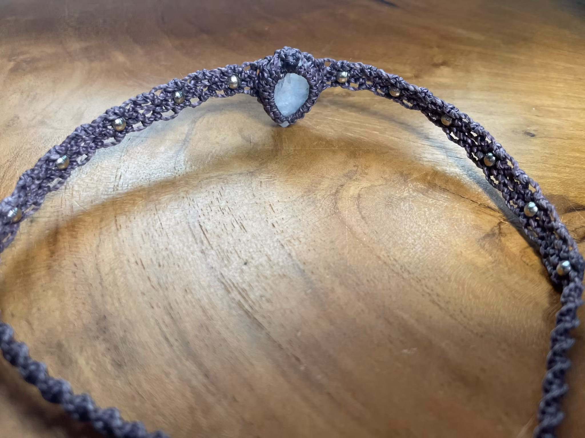 Unik och handknuten choker/pannband i makramé, skapad av Maria Florencia (@bohemiflow). Detta mångsidiga smycke kan bäras både runt halsen som choker och som pannband och är ett resultat av genuint hantverk.