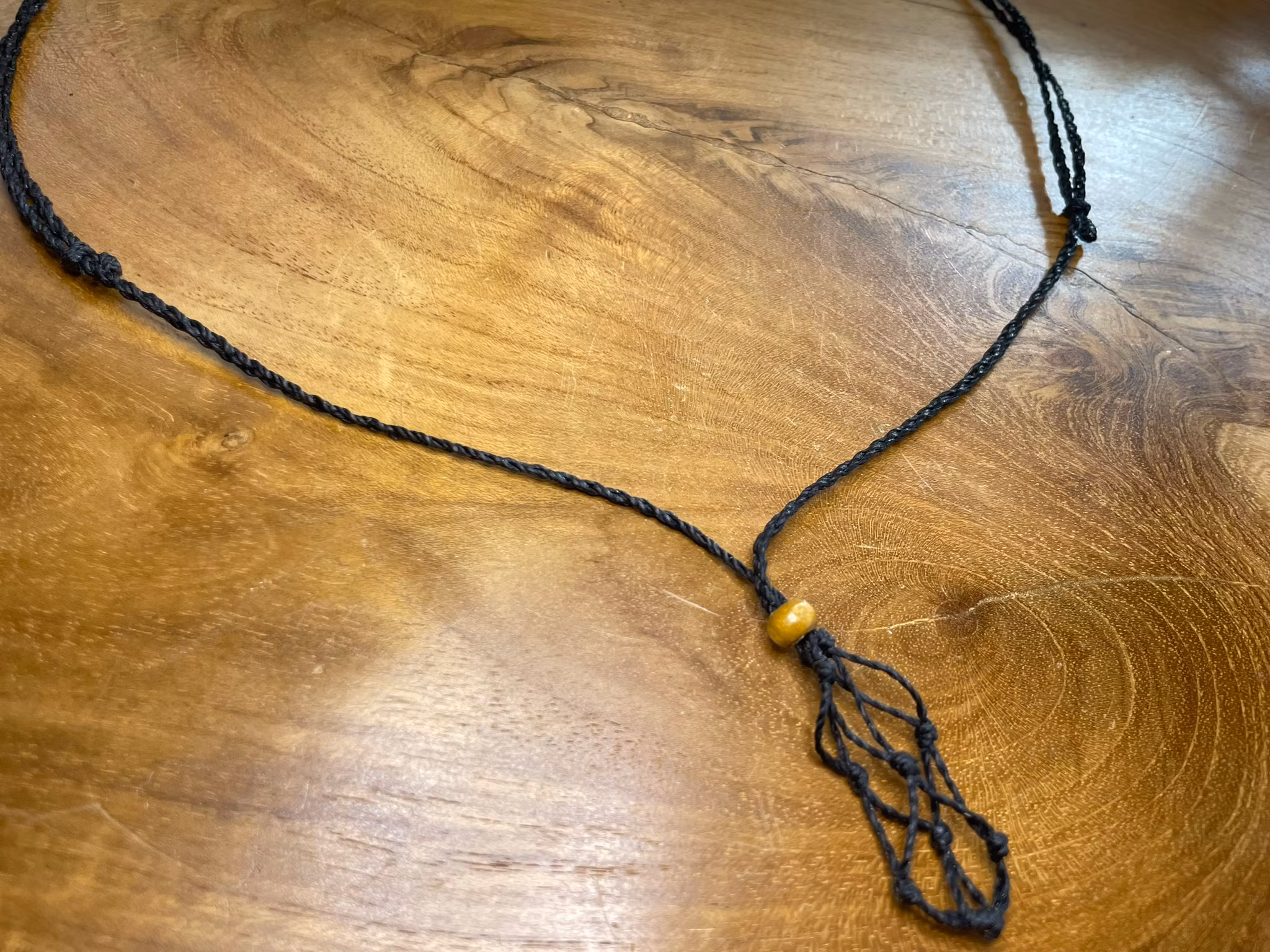Ett handflätat enkelt halsband i svart vaxad tråd, utformat som en justerbar kristallhållare. Du kan enkelt själv placera och byta kristall i halsbandet genom att föra träpärlan upp för att öppna eller ned för att stänga.